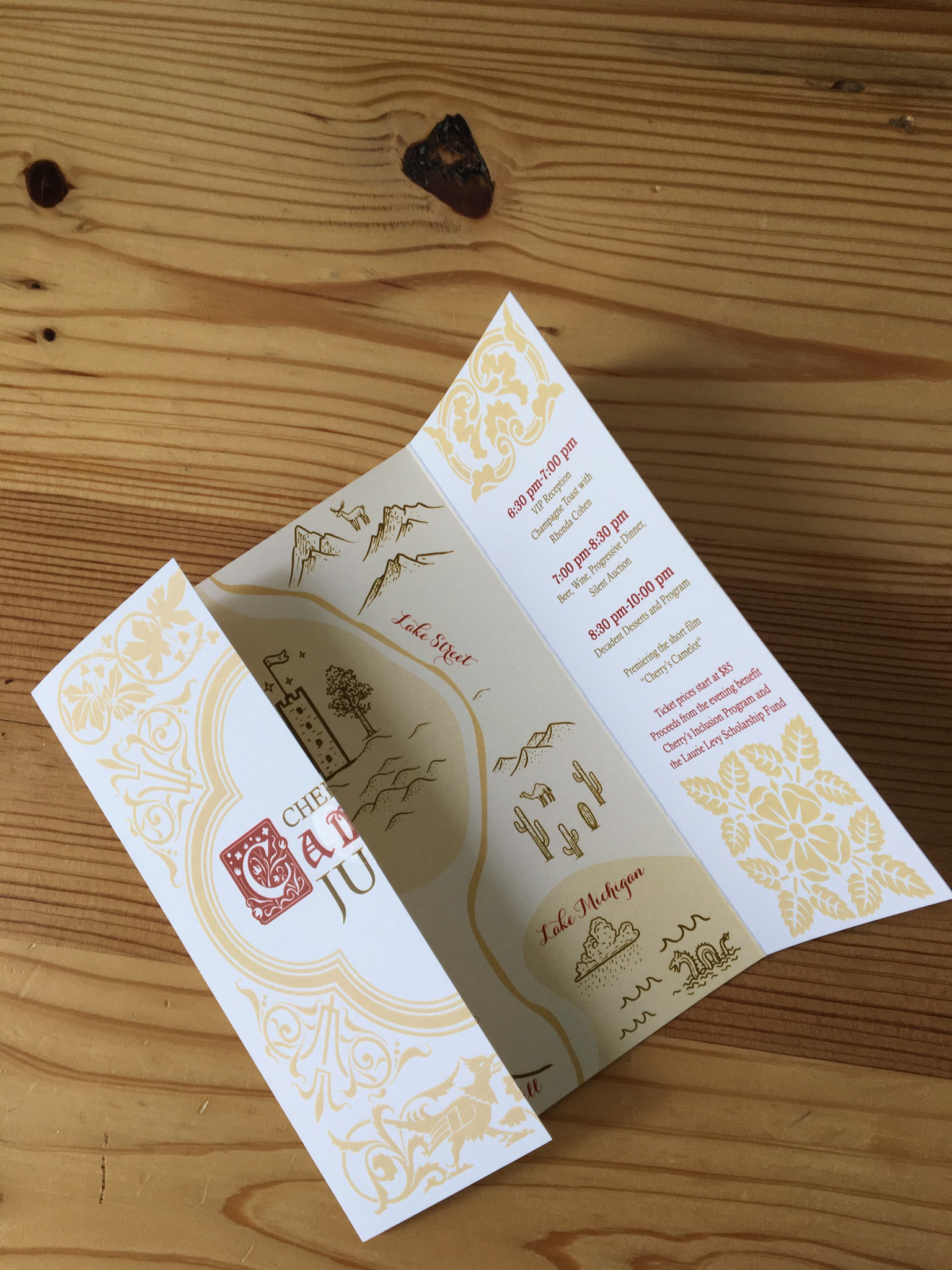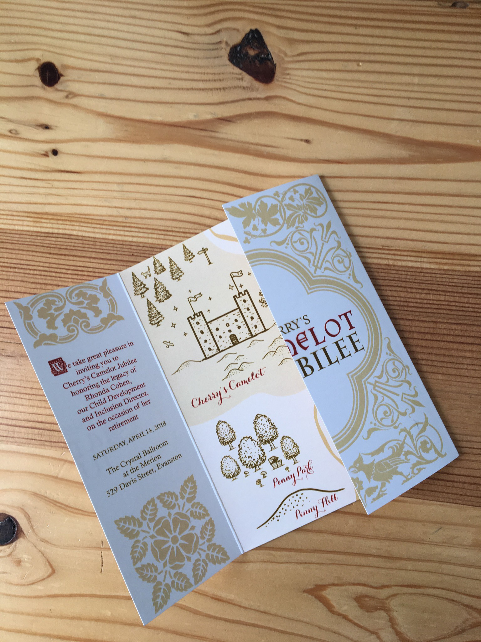 Gate fold invite to Cherry Preschool's Camelot themed annual jubilee.