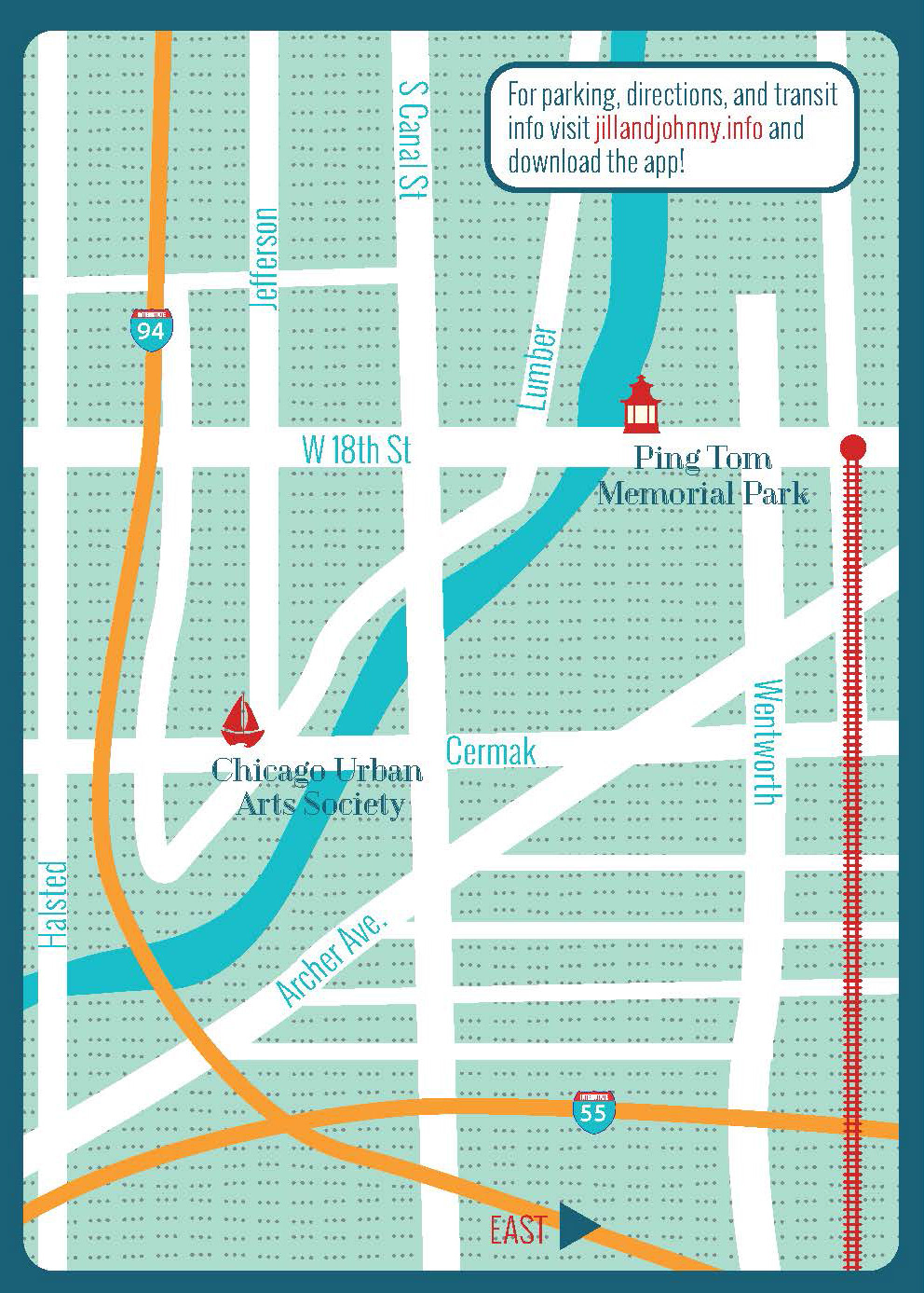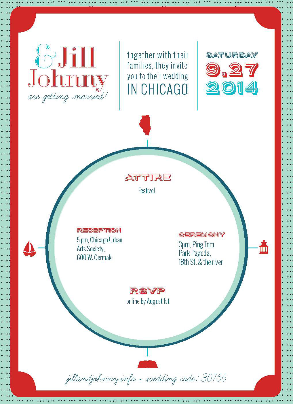 Chicago wedding invite front & back with rotating die-cut disc