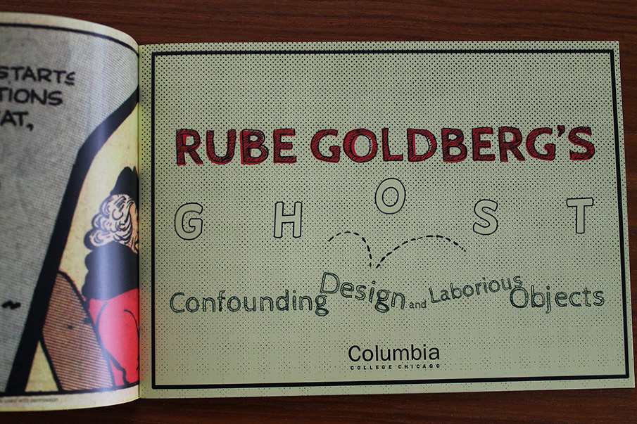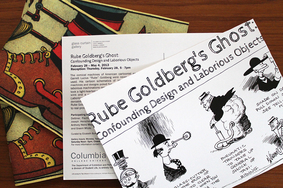 Gallery guide booklets & exhibition cards for art openings at Columbia College Chicago. Rube Goldberg: Confounding Design and Laborious Objects, Black Gossamer, and Midwinter.
