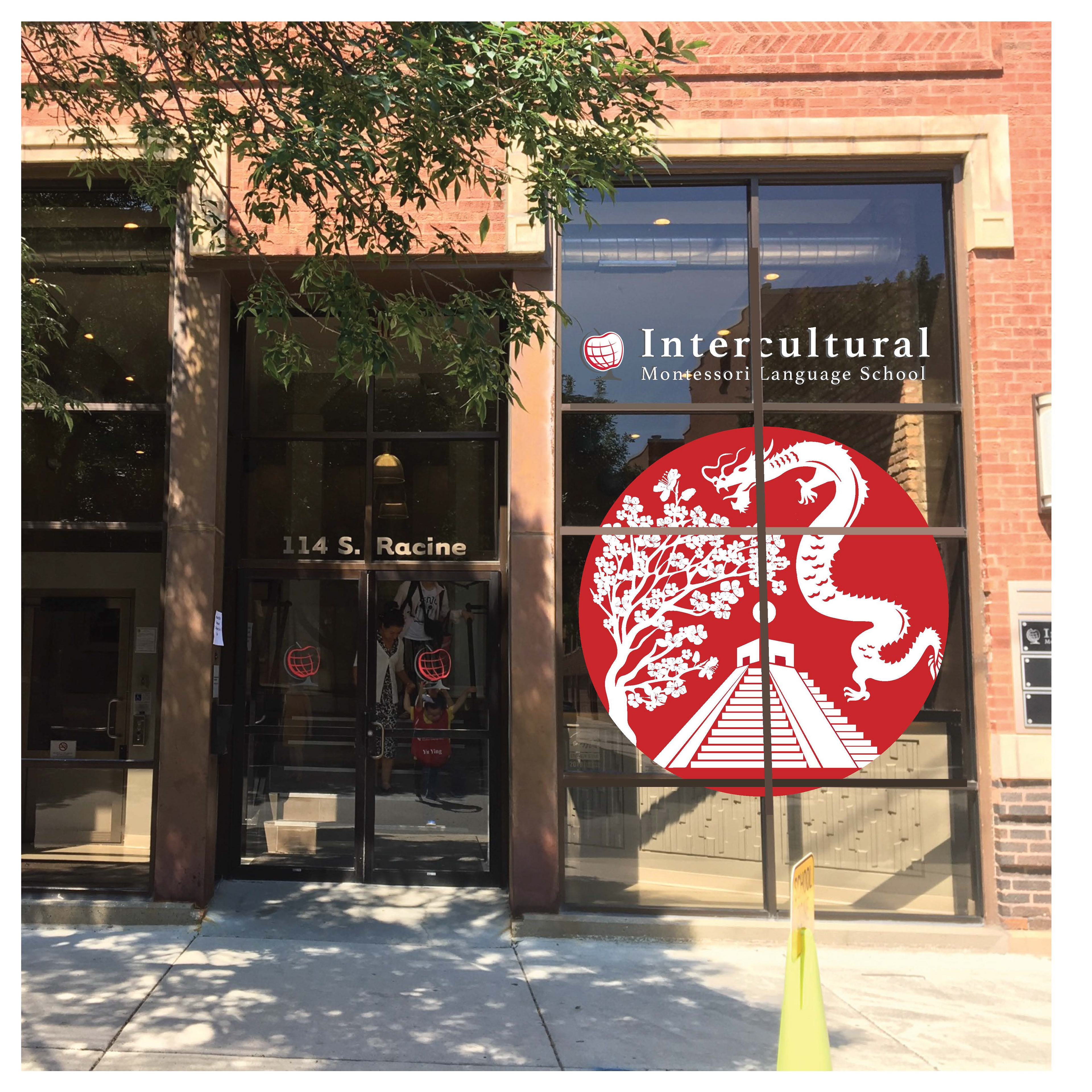 Logo & window design for Intercultural Montessori Language School, a dual-language immersion elementary & middle school in Chicago.